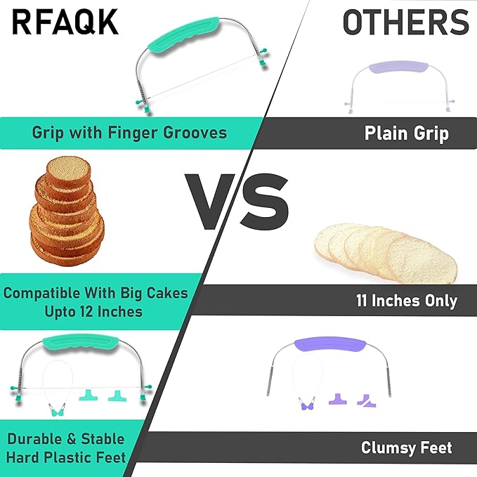- 😌 قبضة يد مريحة: تم تطوير قبضة اليد المريحة لتوفير تحكم أفضل أثناء التقطيع، بالإضافة إلى المقابض المجوفة التي تناسب أصابعك بشكل مثالي. كما يضمن وجود أقدام بلاستيكية صلبة استقرارًا مثاليًا لحامل تقطيع الكيك، مما يحافظ على ثباته أثناء التحرك بسلاسة عبر سطح العمل.