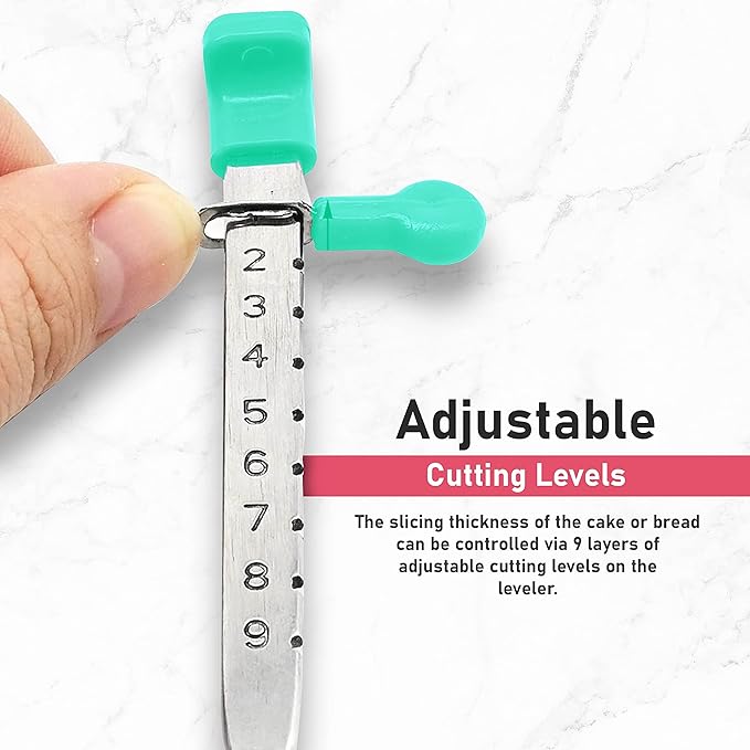 - 🍞 شرائح متساوية وموحدة: تتيح أداة تسوية وتقطيع الكعك الاحترافية ذات الشد القوي للطهاة المبتدئين في مجال الحلويات إمكانية وضع طبقات الكعك بدقة متناهية. حيث يمكنكِ تعديل السلك للأعلى أو للأسفل على 9 مستويات مختلفة، مما يتيح لكِ الحصول على طبقات ناعمة وجميلة بالارتفاع المناسب (يتراوح بين 0.25 بوصة إلى 2.5 بوصة).
