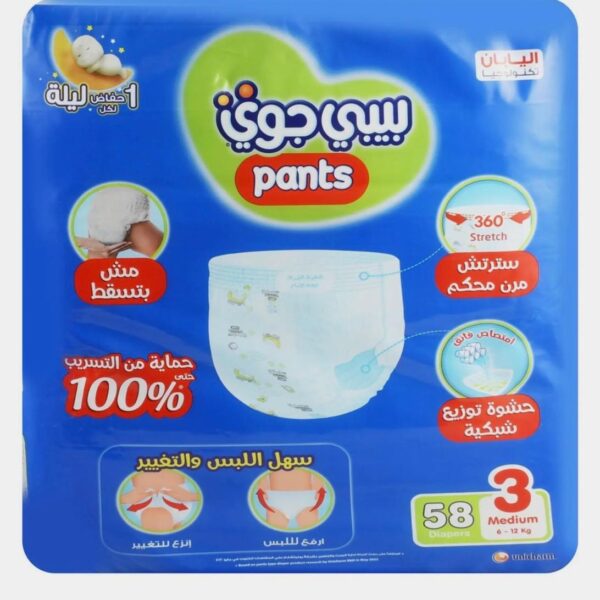 • سراويل حفاضات بيبي جوي تأتي في عبوة ضخمة مكونة من 58 قطعة، مما يضمن حصولك على كمية كافية لاحتياجات طفلك.