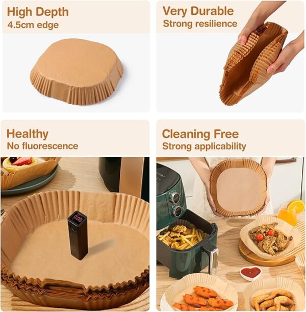 - مادة آمنة غذائيًا: البطانات الورقية للقلاية الهوائية مصنوعة من ورق الزبدة عالي الجودة، وهي مقاومة للماء والزيت وغير لاصقة ومقاومة للحرارة ويمكنها تحمل درجات حرارة تصل إلى 220 درجة مئوية. ولا يؤثر ورق الزبدة للقلاية الهوائية للخبز على المذاق الأصلي للطعام.