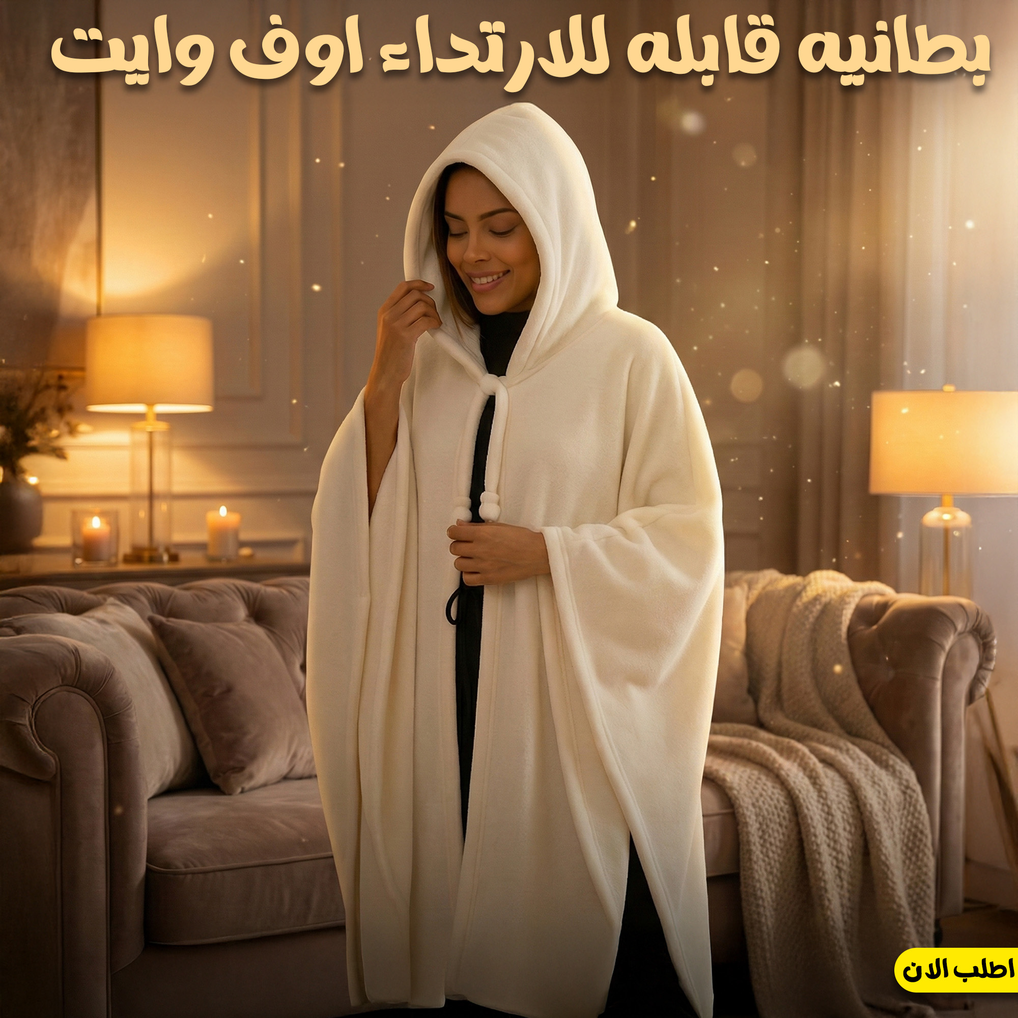 بطانية قابلة للارتداء باللون الاوف وايت مصنوعة من خامة مخملية ناعمة جدًا بتحتفظ بالحرارة وتدي إحساس دفء رهيب. تصميمها واسع ومريح وبييجي مع هودي وحبال ربط عشان تقدري تثبتيها وما تتحركش. مناسبة للوقت اللي قدام التلفزيون، الشغل على اللاب، أو حتى النوم الخفيف.